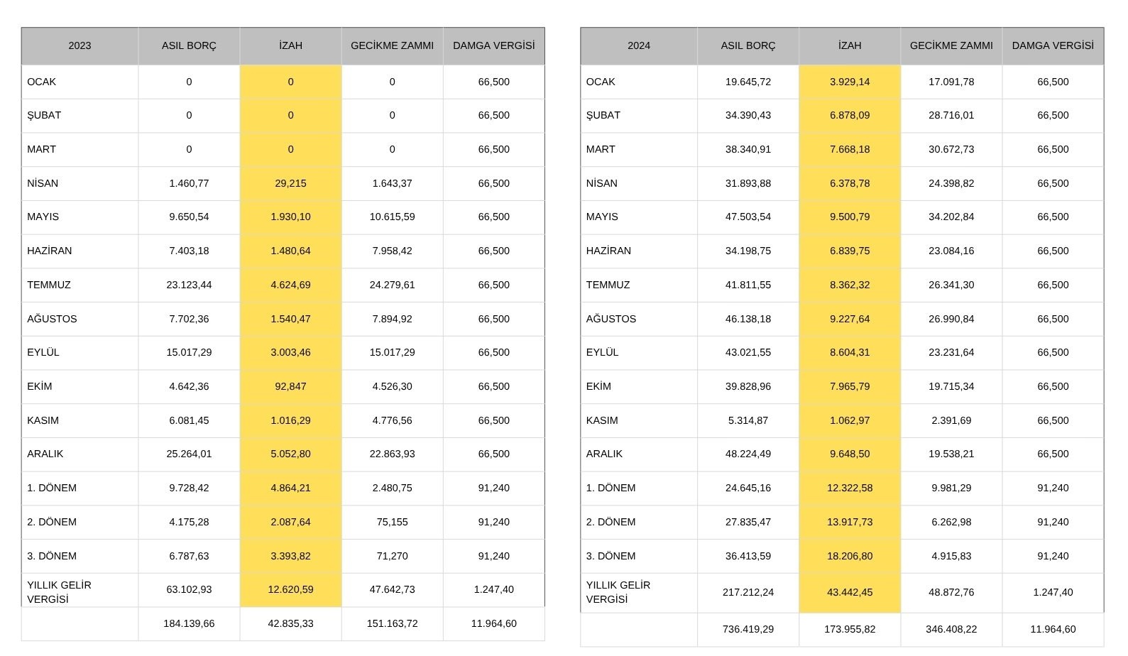 2023 ve 2024 yılı Asıl Borç, Gecikme Zammı, Damga Vergisi ve İzah Uzlaşma tabloları