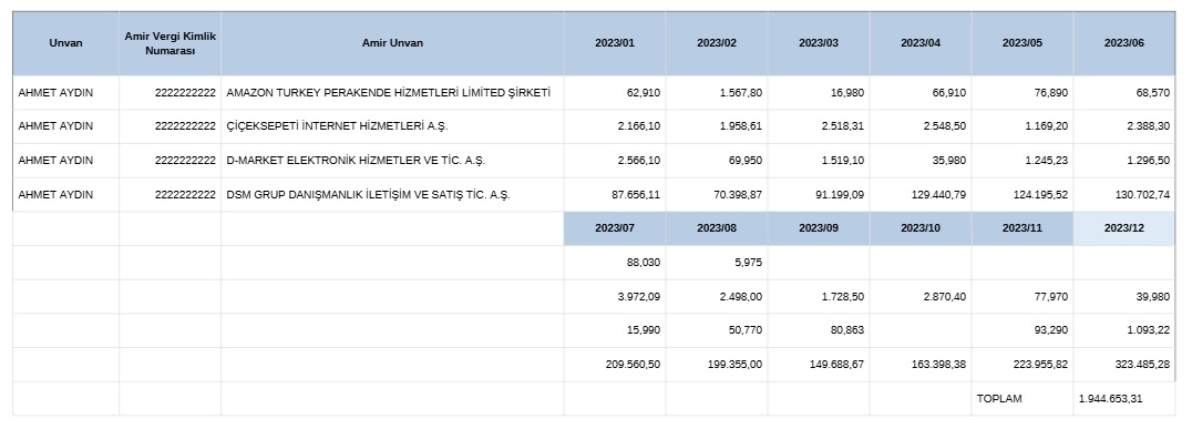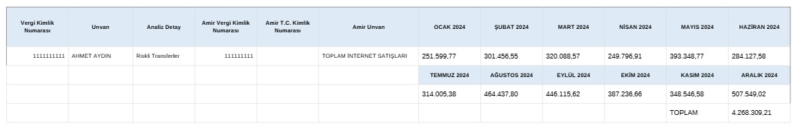 2024 yılına gelindiğinde Ahmet Aydın’ın şahıs şirketi satış cirosu 4.268.309,21 TL’ye yükselmiştir. Yine KDV oranı %20 olduğundan dolayı bu tutar, yaklaşık 3.556.924,34 TL matraha denk gelmektedir. Vergi dairesi tarafından hazırlanan izaha davet raporunda, hangi platformdan, hangi tarihte satışların oluştuğu ve ilgili aylara göre dağılım detaylı şekilde gösterilir.